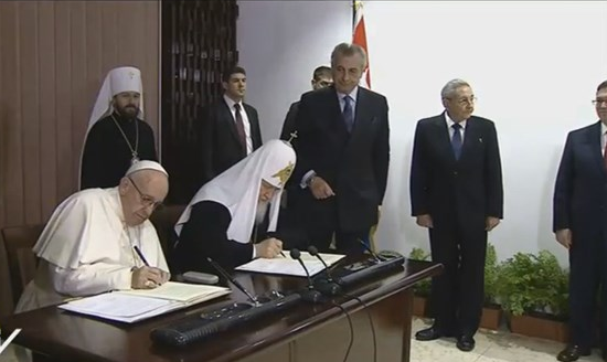 1. Волею Господа Бога, від якого походять всі дари, в ім’я Господа нашого Ісуса Христа, з допомогою Святого Духа Утішителя, ми, Папа Франциск і Кирило, Патріарх Московський та всієї Руси, зустрілися сьогодні в Гавані. Дякуємо Богові, прославляємо Пресвяту Тройцю за цю першу в історії зустріч.