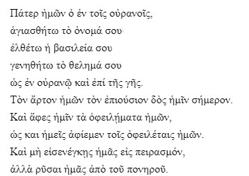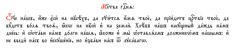 Отче Наш, що єси на небесах, нехай святиться Ім'я Твоє, нехай прийде царство Твоє, нехай буде воля Твоя, як на небі, так і на землі. Хліб наш насущний дай нам сьогодні; і прости нам провини наші, як і ми прощаємо винуватцям нашим; і не введи нас у спокусу, але ізбав нас від лукавого.