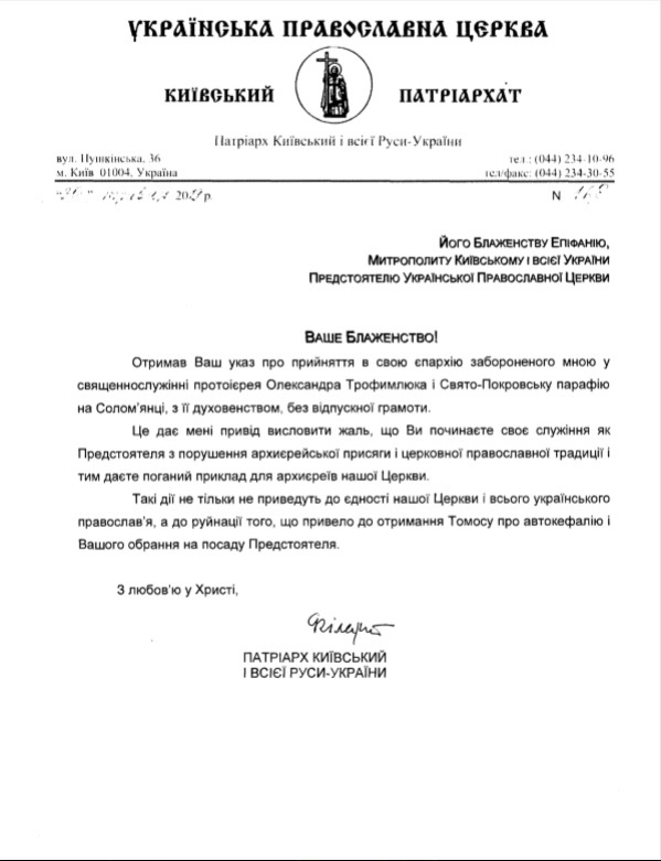 Отримав Ваш указ про прийняття в свою єпархію забороненого мною у священнослужінні протоієрея Олександра Трофимлюка і Свято-Покровську парафію на Солом’янці, з її духовенством, без відпускної грамоти.
